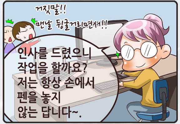 我總是把筆握著不放呢~ 저는 항상 손에서 펜을 놓지 않는 답니다~.